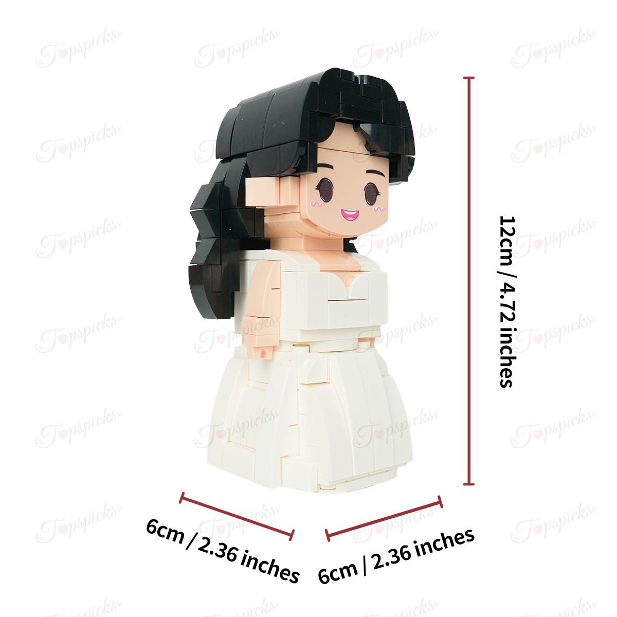 This delightful building block model features a beautifully designed character in a white gown, showcasing intricate details and a vibrant expression. Standing at 12cm (4.72 inches) tall and 6cm (2.36 inches) wide, this charming figure combines creativity and style, making it a perfect addition to any collection.